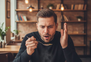 Другим пусковым механизмом служит повреждение слизистой оболочки рта. Язык щиплет при бруксизме, привычке прикусывать кончик при волнении. Жжение в горле и на языке может быть следствием ожогов, травм, частого употребления острых, кислых, а также специфических продуктов питания. Почему становится горячий язык после еды? Грубая пища вызывает локальное раздражение нервных окончания, а зачастую и аллергию у некоторых людей.